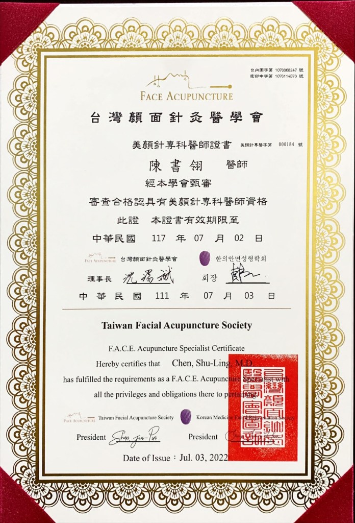 目前二代美顏針需要參加顏面針灸醫學會舉辦的考核獲得美顏針專科醫師資格才可以施作,拿到美顏針專科醫師資格後我也在去年獲得學會邀請擔任助教,協助學員醫師練習及示範。